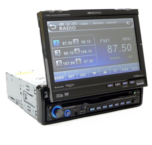* In-Dash DVD, CD, MP4,and Navigation Ready Receiver with Remote * Navigation Ready: Soundstream NAVIBOX-1 required and sold separately * 7" Touchscreen retractable monitor * Full-color display * Wireless remote control included * Blue button lighting * Power Output: o Peak: 50 watts x 4 channels o RMS: 20 watts x 4 channels * MP3 ID3 Tag Display (Title/Artist/Album) * Playback of DVD, DVD-RW, DivX, CD, CD-R, CD-RW, MP3, and WMA * Tuner with 18FM/12AM presets * 3-Band equalizer with 5 Preset tone curves (rock, pop, classic jazz, user) * LO/DX and stereo mono selector switch * Variable subwoofer volume control * 3 Sets of 2V preamp outputs (front, rear and subwoofer) * Navigation Ready: Soundstream NAVIBOX-1 Required and sold separately * iPod Ready: Soundstream IC-2 Required and sold separately * * Front-panel USB input: MP3, DivX, Xvid and MP4 Movies * 1 Auxiliary video input for back-up camera * 1 A/V Input for secondary source * 1 RCA Video output * Fourteen on-screen display languages * 30-Second anti-shock mechanism * IR Repeater function for external remote eye * Antenna trigger wire * Amplifier trigger wire * Auto store pre-set scan * Digital clock * USA/Europe frequency * Full function remote control * Last position DVD Memory * Improved graphic user interfaceSound Stream VIR-7840NR Single Din 7-Inch Touch Screen , Digital TFT-LCD Screen With AM/FM/DVD Specifications